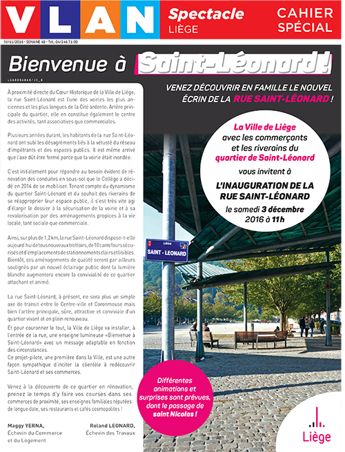 - 8 pages « Cahier spécial Saint-Léonard » dans le Vlan Liège soit 81.000 exemplaires ainsi que 500 tirés à part diffusé dans le quartier Saint-Léonard.