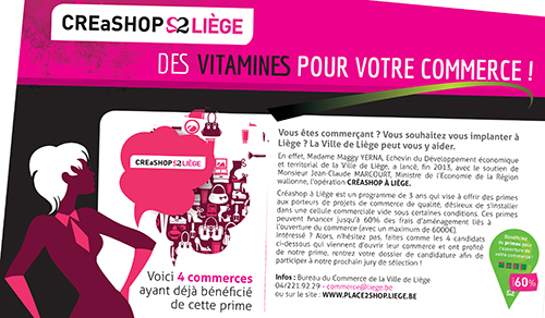 - 3 x 1 page dans le Vlan Liège soit 81.000 exemplaires pour la promotion des nouveaux commerces ouverts qui ont profité de la prime Créashop.