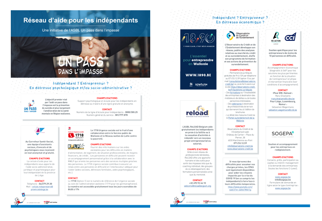 Elle reprend les différents points de contact pour les indépendants (en personne physique ou en société) en difficultés, tant au niveau professionnel que personnel. Cet outil est utile dans le cadre du contexte actuel de la crise de la COVID-19 mais peut également avoir une portée plus large. "